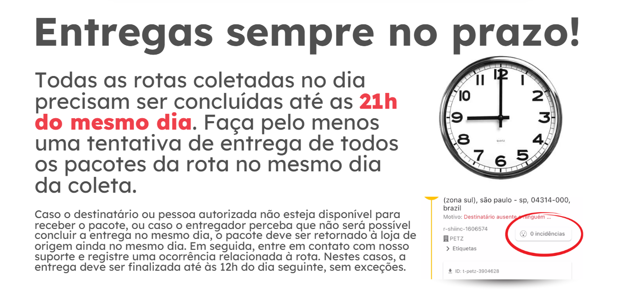 Faça pelo menos uma tentativa de entrega de todos os pacotes da rota no mesmo dia da coleta. O horário máximo para finalizar uma rota aceita e confirmada e até às 21h.