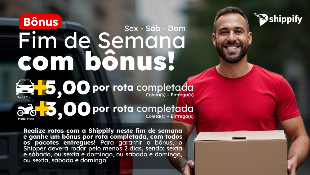 Fim de semana com bônus na Shippify! Realize entregas na sexta, sábado e domingo e ganhe bônus por rota completada! Consulte os detalhes e garanta seu extra!